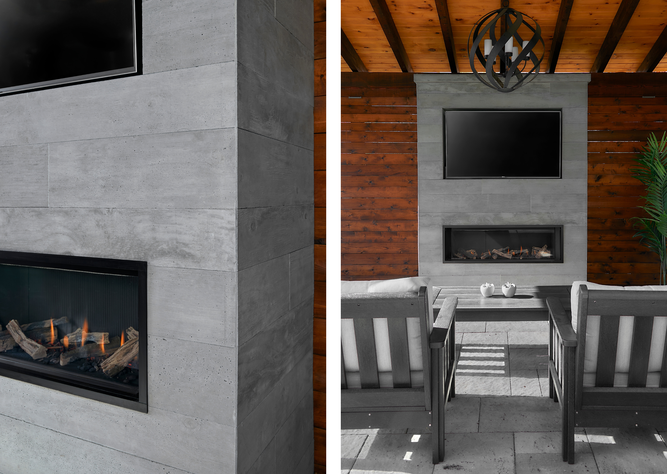 To counter winter’s chill, a thoughtfully placed privacy wall blocks the wind while anchoring a striking concrete fireplace at the heart of the patio. Concrete wall panels, chosen for their exceptional durability, are moulded with a board-formed texture that withstands harsh winter elements.